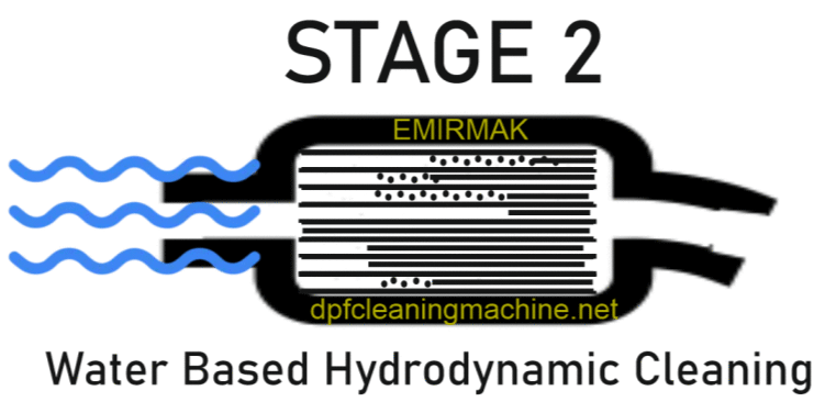 Con el método de limpieza DPF hidrodinámica circulante de EMIRMAK, la bomba de circulación hace circular continuamente agua caliente y solución especial de limpieza DPF en los canales del DPF. Un mínimo de 8 toneladas de agua por hora pasan a través de los canales del DPF. Durante la circulación, se realiza la limpieza neumática, es decir, se aplica un pulso de aire, lo que genera hidrodinámica y los canales del DPF se limpian completamente. En otros métodos de limpieza hidrodinámica del mercado, se presiona algo de agua en el DPF y luego se aplica presión de aire comprimido para crear hidrodinámica, repitiendo este método 30-50 veces. Este método por sí solo es muy insuficiente. Es imposible limpiar catalizadores y DPF, especialmente cristalizados y con capa de carbono formada, con este método. Porque no hay paso continuo de agua a través de los canales del DPF y se aplica principalmente con agua fría, y el agua fría no disuelve la suciedad petrificada y cristalizada. Por lo tanto, es realmente una pérdida de tiempo y un trabajo de mala calidad. Recomendamos elegir y comprar una máquina de limpieza hidrodinámica circulante para quienes piensan comenzar un negocio de limpieza DPF.