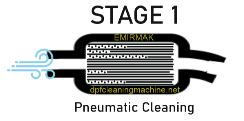 La limpieza neumática DPF, conocida en el mercado, se aplica directamente a los poros del DPF uno por uno con alto flujo y presión de aire. Este método requiere una potencia de compresor de aire muy alta cuando se usa solo, y el DPF a menudo necesita pasar por una serie de procesos antes de la limpieza neumática. EMİRMAK aplica el método de limpieza neumática superficialmente con un tanque de choque de aire especial, ya que en la siguiente etapa se realizará la limpieza hidrodinámica, no es necesaria una aplicación profunda, por lo que no se requieren altos costos de equipamiento ni más mano de obra.