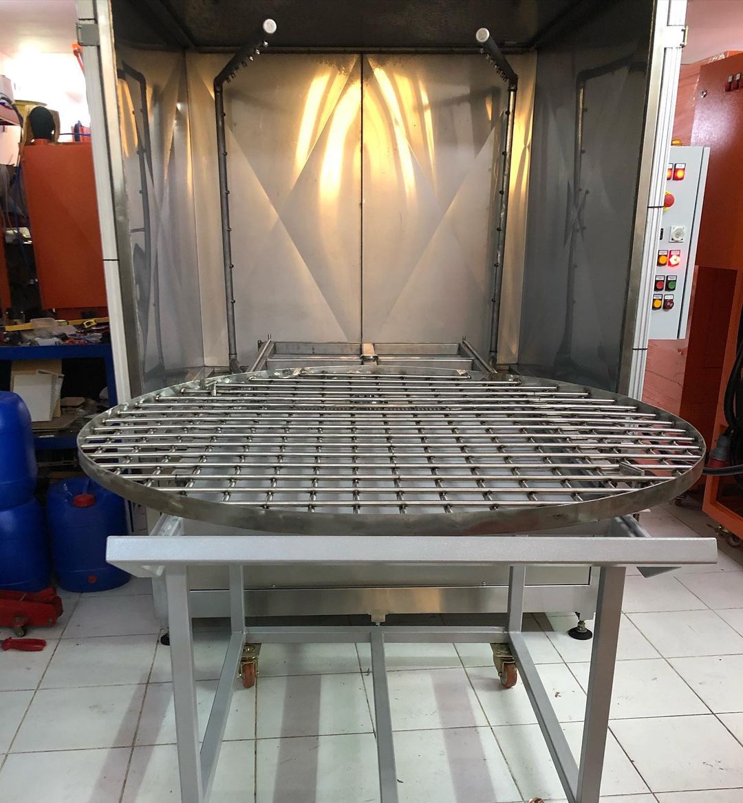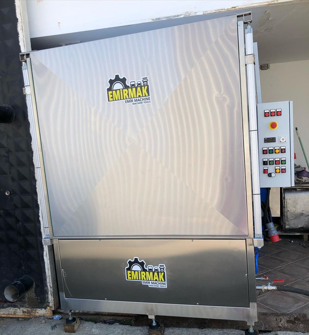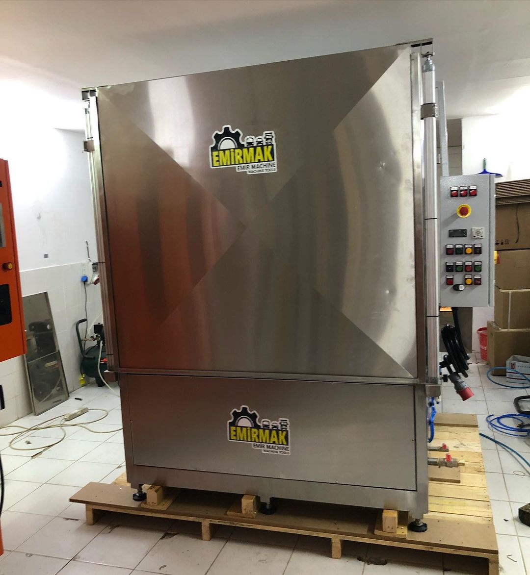 Las piezas que se lavarán se colocan en una cesta que está situada sobre una plataforma giratoria de acero inoxidable con sistema deslizante y se lavan en un gabinete cerrado con agua caliente a presión y detergente. El proceso de lavado se realiza mediante boquillas de agua que están temporizadas y son compresivas según la estructura de la pieza y el grado de suciedad; limpian los residuos, aceite y virutas en superficies sucias desde varios ángulos. La máquina ha sido diseñada para consumir mínimamente agua, detergente, electricidad y tiempo (mano de obra) con un sistema de agua cíclico y filtrante.